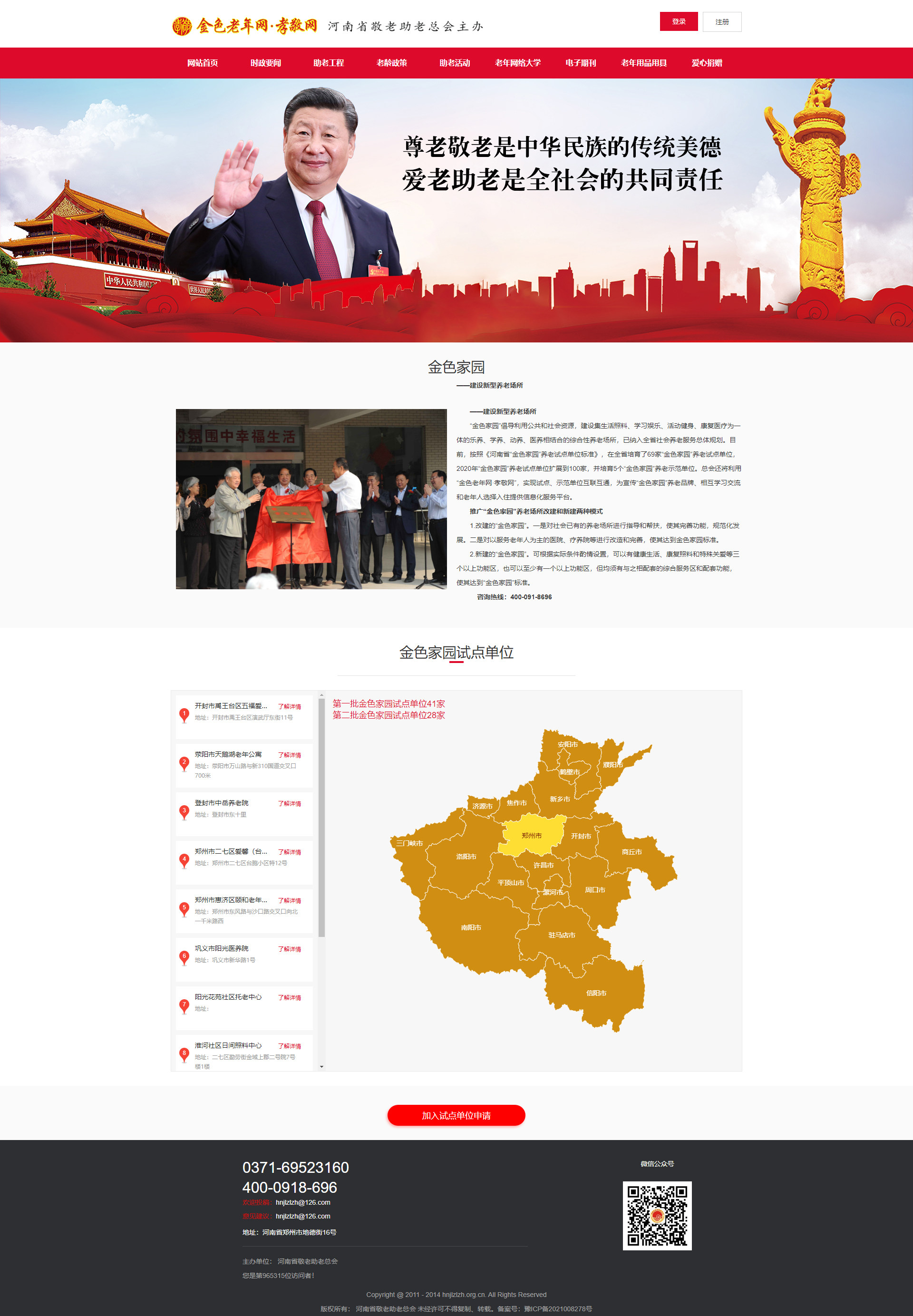 河南省敬老助老总会是由省委老干部局主管,经省民政厅批准的公益性社团组织。网站主要实现信息展示、十大金色品牌栏目、音频视频播放、电子期刑、爱心捐赠等多个功能与版块,是规模较大的综合功能类网站。