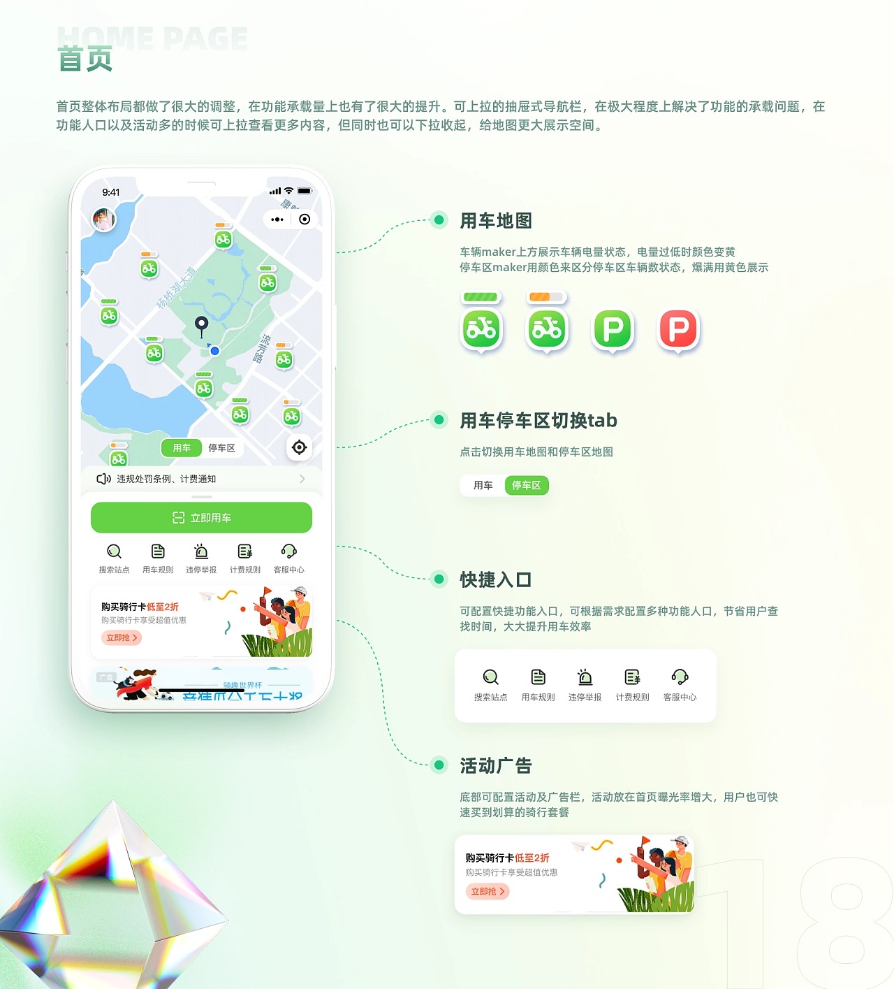 项目背景:拥有骑行与导航功能的APP,地图页显示车辆地点,支持扫码开锁,站点导航等功能。